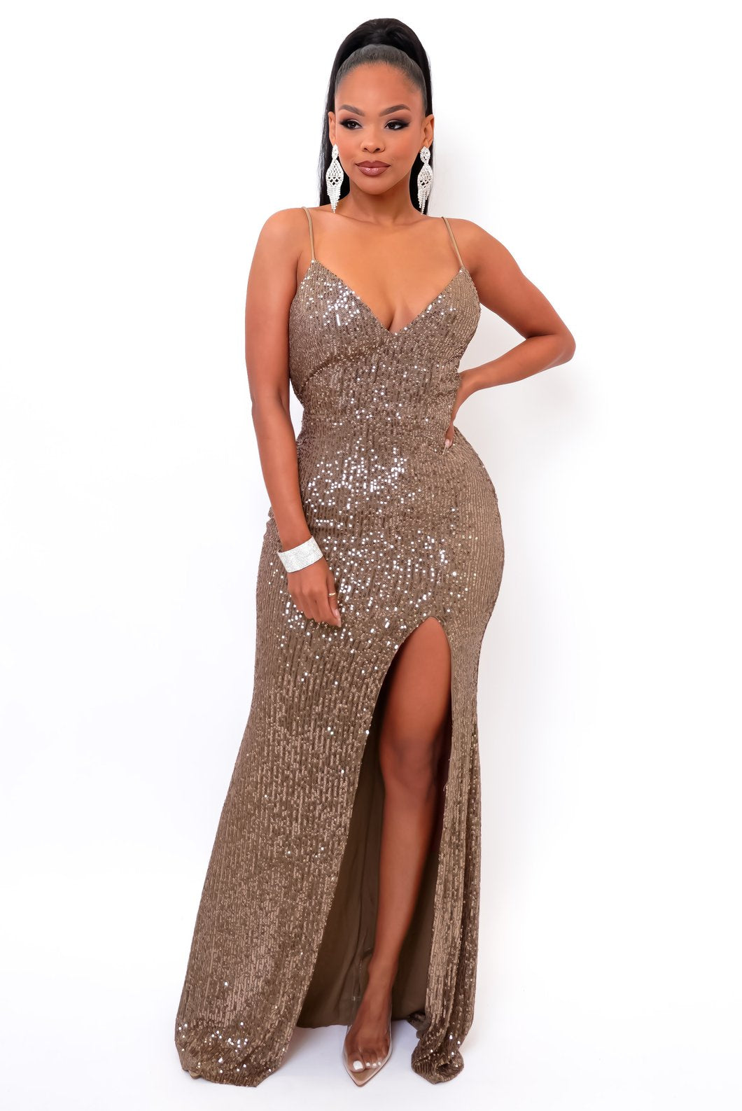 ShopThe outfit of the month is a beautiful iced coffee sequins dress. It is perfect for the holidays and different occasions. It has two spaghetti straps and a slit on the side. Click on shop button to view it.