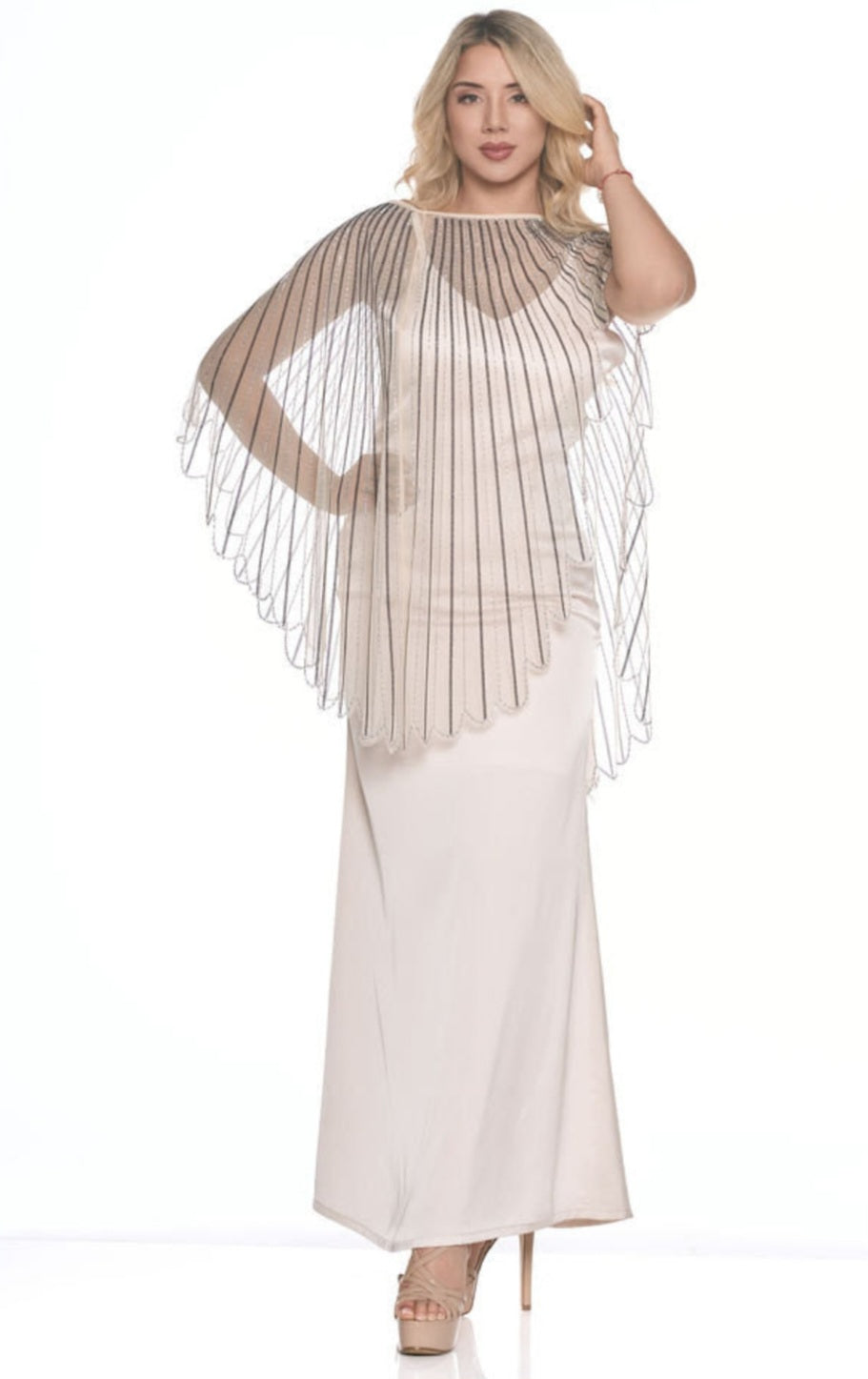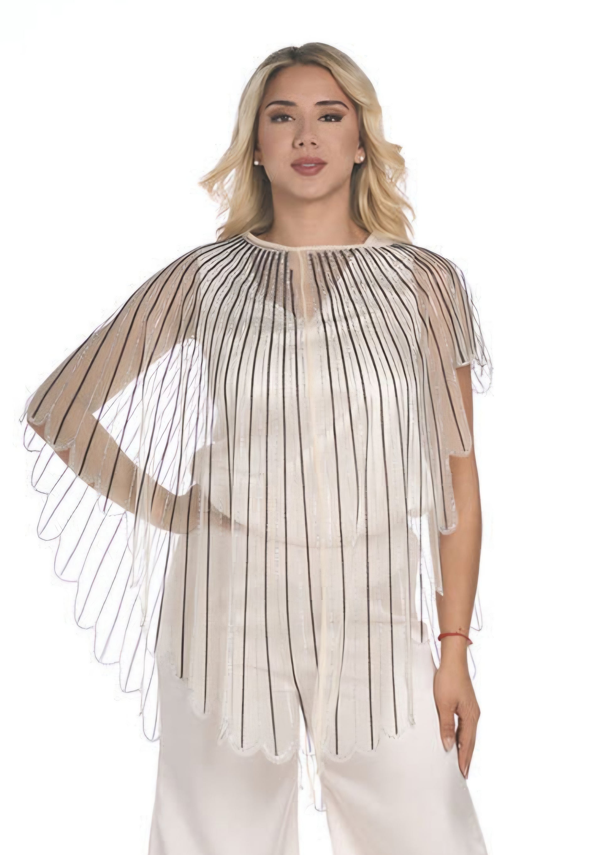 This shimmering sheer shawl is the perfect finishing touch for any elegant outfit. It features delicate vertical metallic stripes that catch the light beautifully, creating a radiant, eye-catching glow. The scalloped hem adds a soft, feminine detail, while the long, draped sleeves offer graceful movement with every step.