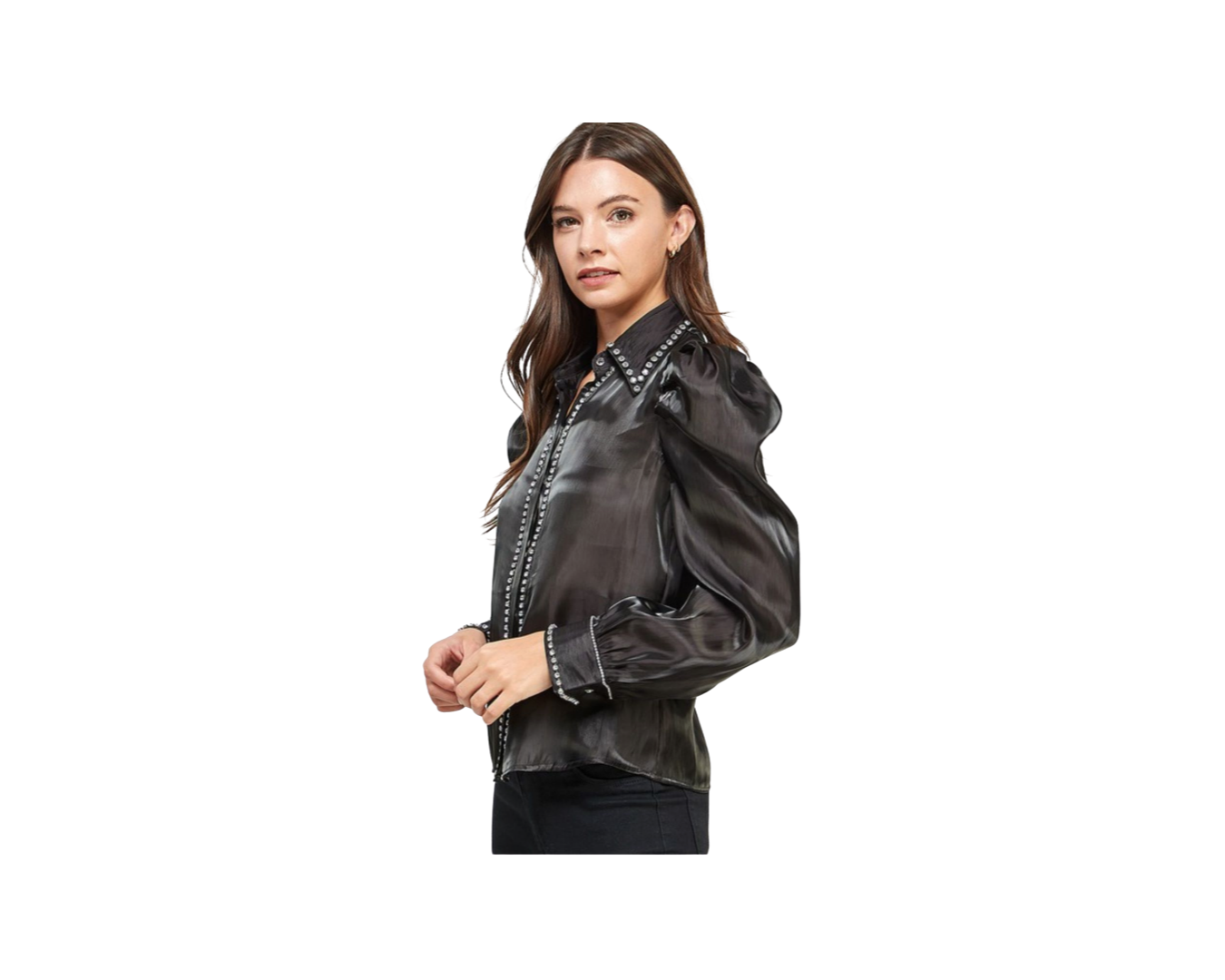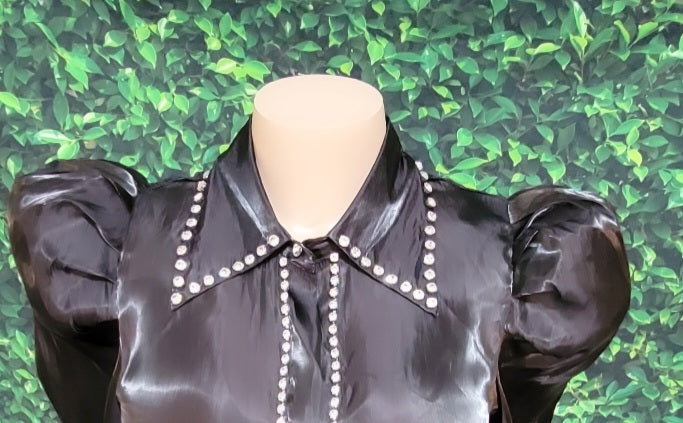 This beautiful shirt has long puffed sleeves with rhinestones around the collar, cuff, and down the front.