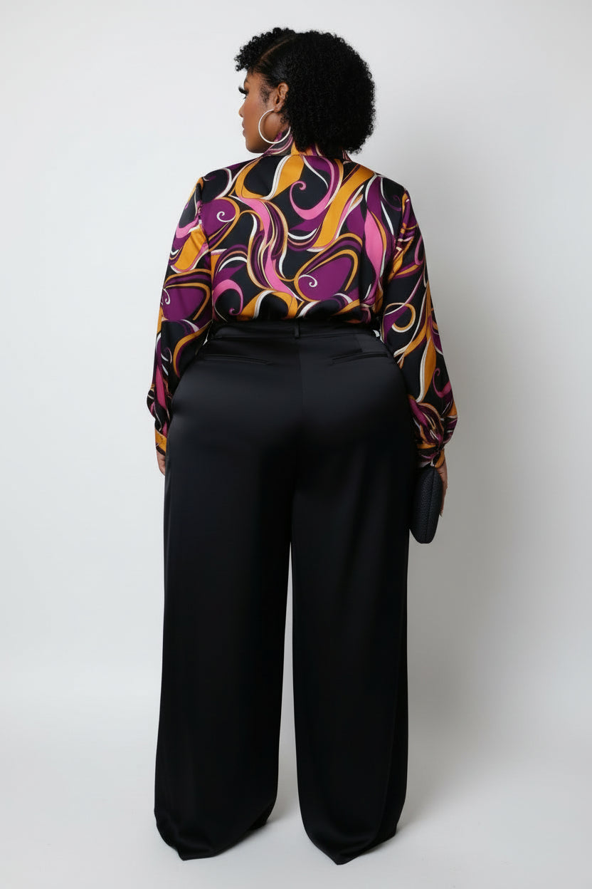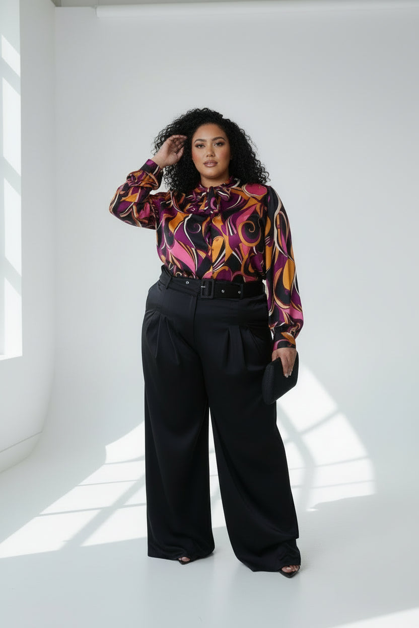 This dressy blouse is very stylish that has sash ties at the neck. You can pair this dressy long-sleeve top with slacks, jeans, or a suit.